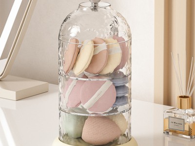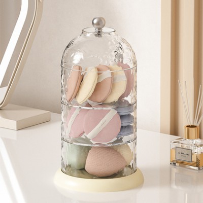»旋转化妆品收纳盒高级感粉扑首饰化妆盒桌面护肤品透明归纳防尘架